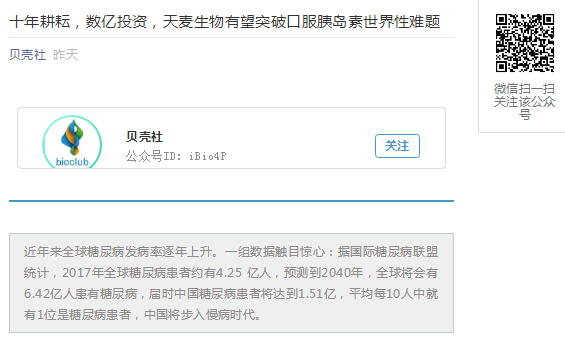 “貝殼網(wǎng)”專(zhuān)訪報(bào)道:十年耕耘,數(shù)億投資,天麥生物有望突破口服胰島素世界性難題